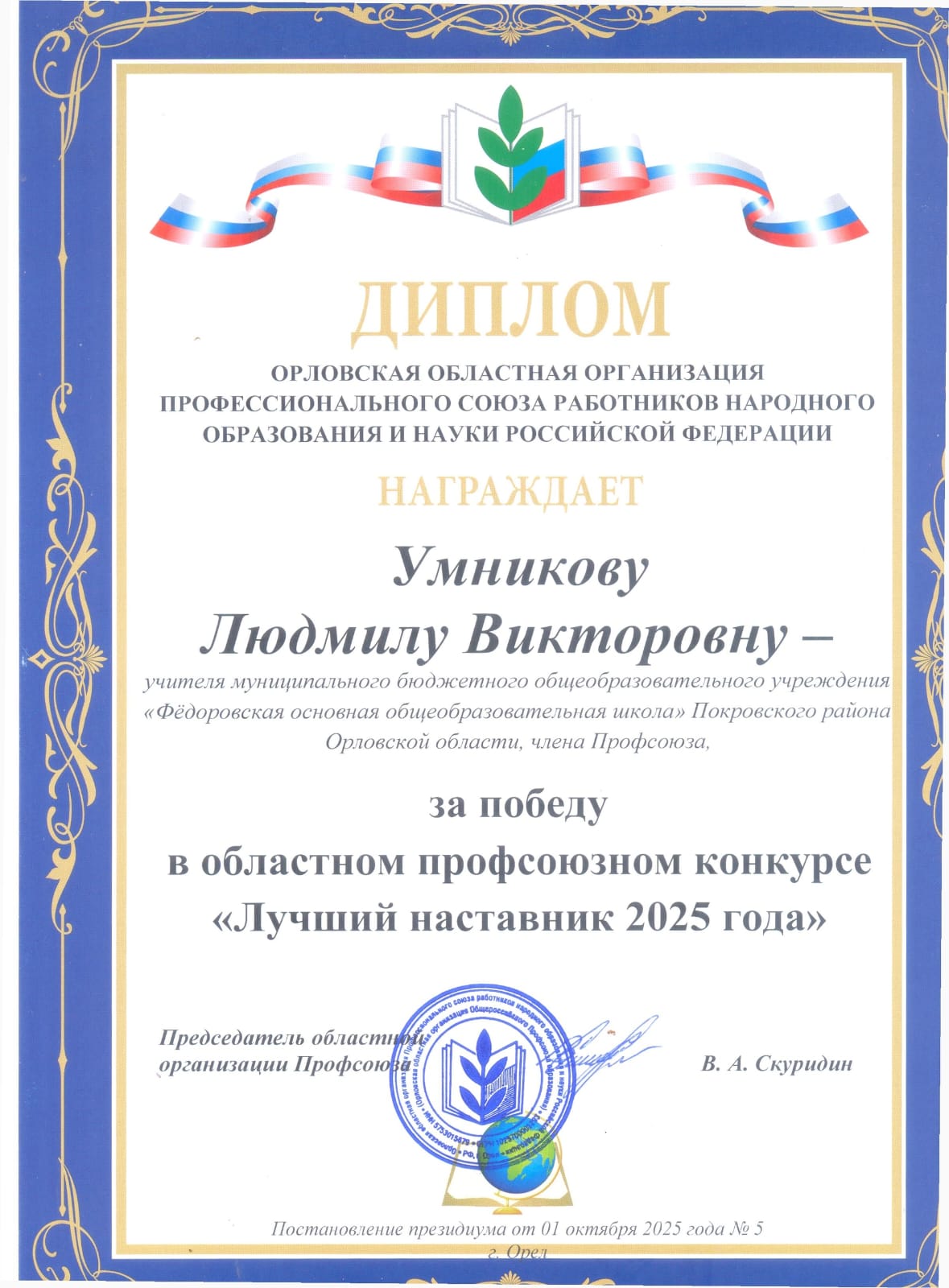 25 октября 2025 года в Орловской областной организации профессионального союза работников народного образования и науки РФ в рамках открытия педагогического клуба «Наставник» состоялась церемония награждения победителей областного конкурса «Лучший наставник 2025 года». Победителем данного конкурса от Покровского района стала учитель МБОУ «Фёдоровская основная общеобразовательная школа» Умникова Людмила Викторовна.